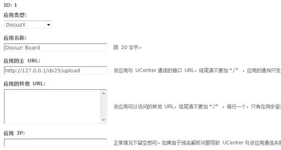 应用IP:正常情况下留空即可。如果由于域名解析问题导致 UCenter 与该应用通信失败,请尝试设置为该应用所在服务器的 IP 地址;