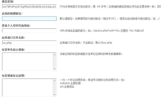 通信密钥:只允许使用英文字母及数字,限 64 字节。应用端的通信密钥必须与此设置保持一致,否则该应用将无法与 UCenter 正常通信;