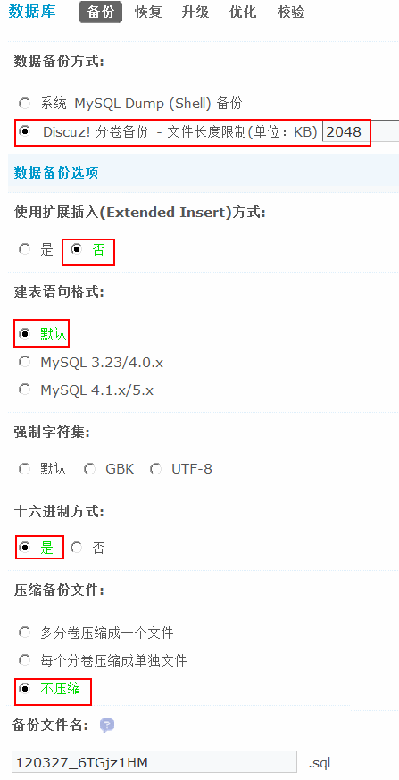 数据库备份方式默认选择为“Discuz! 分卷备份 - 文件长度限制(kb)”,初始化为2048kb(2MB)