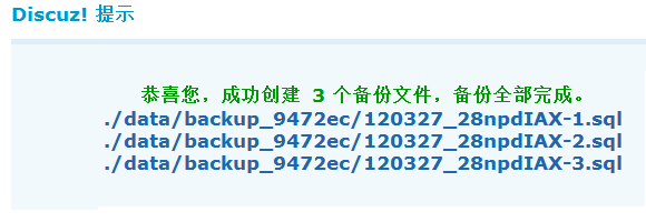 上图中出现的是数据库备份界面,其中的单选选项默认选择了“Discuz! 和 UCenter 数据”,在这里无需其他设置,直接点击提交即可完成站点所有数据的备份工作。