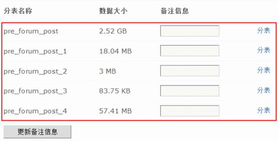 第一次访问帖子分表功能,会看到默认拥有一个主表,名称为 pre_forum_post,此表为安装 Discuz! 后的标准帖子表。新添加的表会自动以“pre_forum_post_数字”的方式进行命名,无需人工干预。