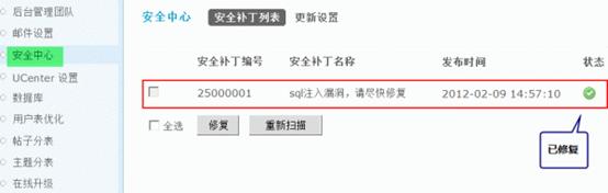 2、站长只要点击“立即修复”即可跳转到后台=>站长=>安全中心中修复补丁。