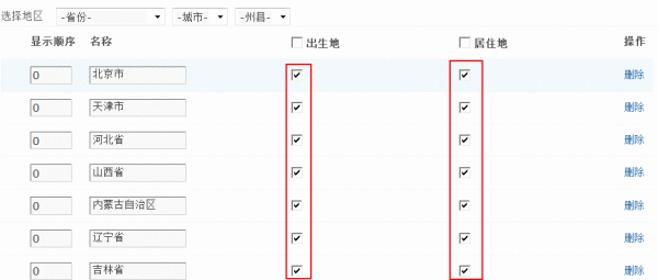 可以在地区设置的首页进行选择,分别有出生地和居住地的开户和关闭选择,打勾即可启该项,反之则关闭该项,关闭后会员将无法选择该地区。