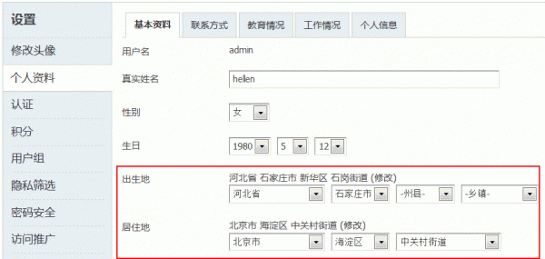 会员可以在站点的个人资料中进行出生地和居住地的选择。