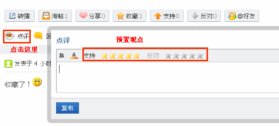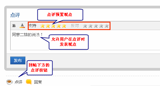 我们以普通主题点评预置观点为例:如果在这里设置了观点,会员在前台点评帖子的时候效果如下:
