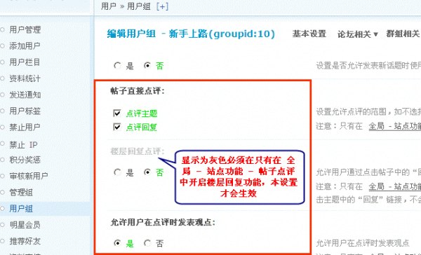 所以,点评功能必须是【后台】=>【全局】=>【站点功能】=>【帖子点评】的设置 和【后台】=>【用户】=>【用户组】=>【编辑】=>【论坛相关】=>【帖子相关】中的点评设置接合使用,才会更完美。