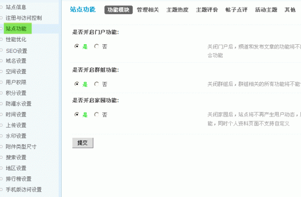站点功能可以对站点的功能模块门户、群组和家园关闭和开启;管理统计、评价、点评和帖子内容以及活动主题进行一些基本的管理操作,功能包括功能模块、管理相关、主题热度、主题评价、帖子点评、活动主题和其他的一些基本操作。