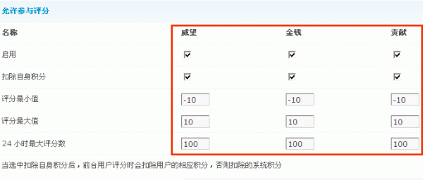 注意:在评分之前需要该用户组有允许参与评分的权限,开启方法:【后台】=>【用户】=>【用户组】=>【其它】=>【积分相关】中,设置如下图所示: