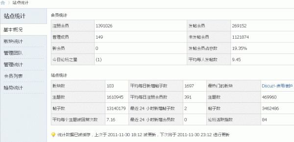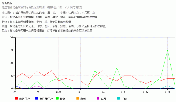同时可以通过综合概况了解到站点的综合概况发展统计,包括来访用户、论坛、群组、家园和互动。