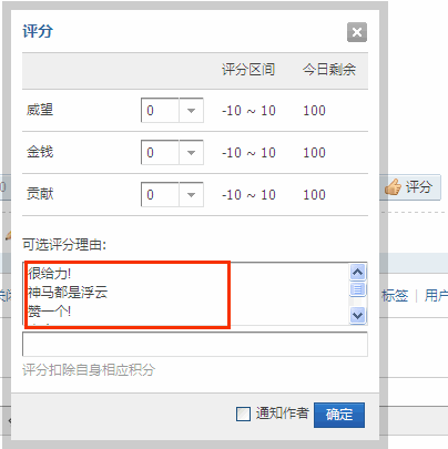 本设定将在用户执行评分时显示,每个理由一行,如果空行则显示一行分隔符“--------”,用户可选择本设定中预置的理由选项