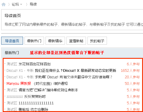 举例:这里设置的值填写为 30,当帖子的热度值达到 30 的时候,便会显示在导航中导读的最新热门下,如下图所示: