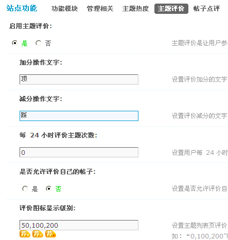 评价图标显示级别:设置主题列表页评价图标每一级别对应的评价指数,我们建议您设置 3 个级别,1 级及以上级别的主题会在主题列表页“查看好评主题”中列出。