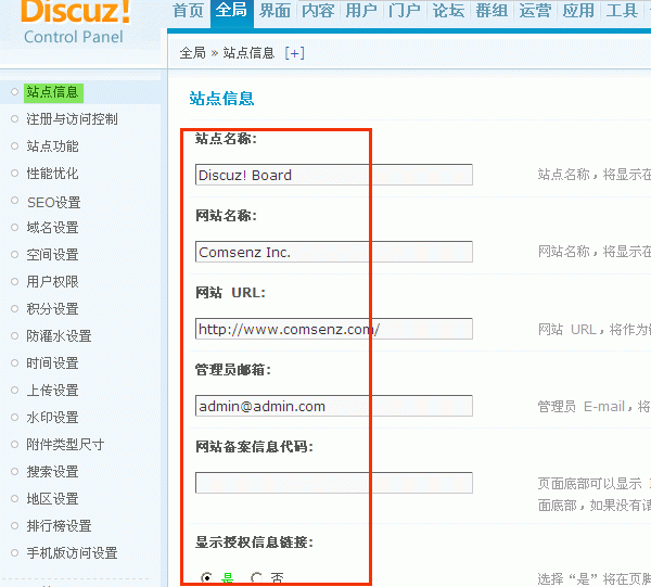 操作路径:【后台】=>【全局】=>【站点信息】中看到如下图所示的页面: