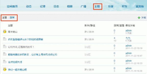 选择是并选择相应的版块那么在个人空间将出现“主题”模块和链接。如下图所示: