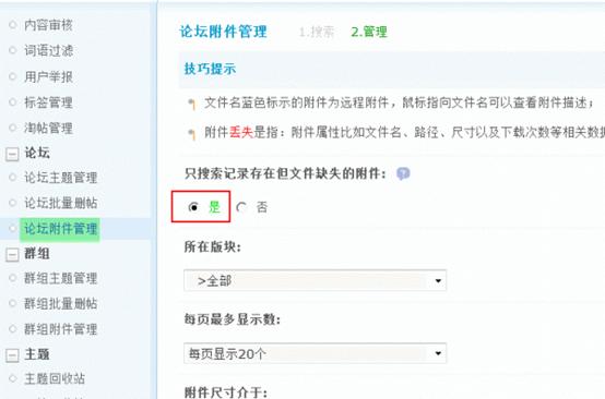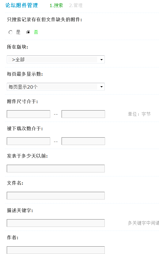 论坛自带了对附件的管理功能。通过这个管理功能,管理员可以根据条件搜索附件,对搜索到的附件进行删除、下载、打开附件所在主题,还可以对附件的数据表进行整理,将服务器上已经不存在的附件的信息在数据表中删除,减小附件表的数据量,进而增加附件检索的速度。