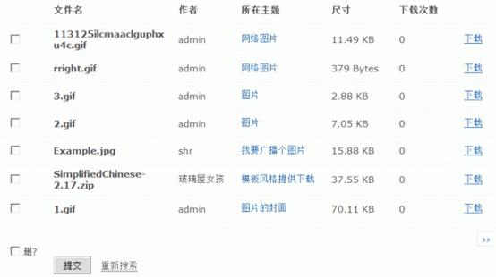 附件的管理,主要包括附件的删除、下载、查看附件所在的路径和查看附件所在主题。当按查询条件提交以后,会看到类似下图所示的搜索结果: