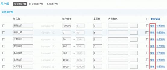 管理员进入论坛【后台】=>【用户】=>【用户组】=> 点击指定用户组后的“编辑”,如下图所示: