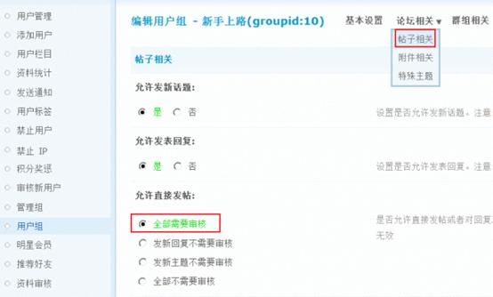 2、设置论坛中发帖需要审核的用户组