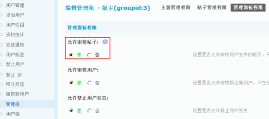 在管理组中设定哪些组可以审核别人的帖子。