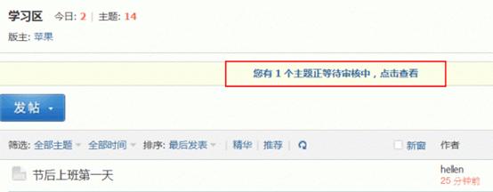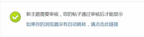 开启帖子审核功能后,会员在发表新帖后,出现提示信息,如下图所示: