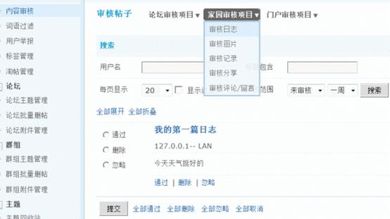 内容审核功能在站点内起到防止灌水,净化站点内容的作用,内容审核包括论坛审核项目、家园审核项目以及门户审核项目。可谓是全方面的涵盖了所有和内容有关的审核,可以大大减少垃圾内容以及广告内容的产生几率。管理者维护站点更加方便、快捷。