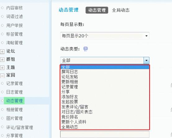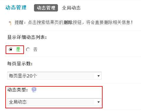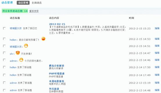 通过动态管理功能,站长可以方便的搜索和管理到站点动态,并且可以发表全局动态。