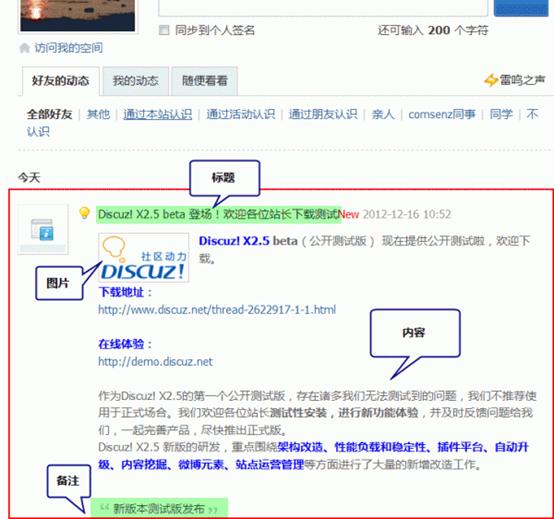 需要注意的是全局动态的发布时间,可以通过填写一个将来的日期和时间,使这条动态会在这个将来的日期到来之前,一直显示在第一位。比如当前的时间是 2012-02-16 10:52,我们可以在这里填写一个将来的时间如:2012-12-16 10:52