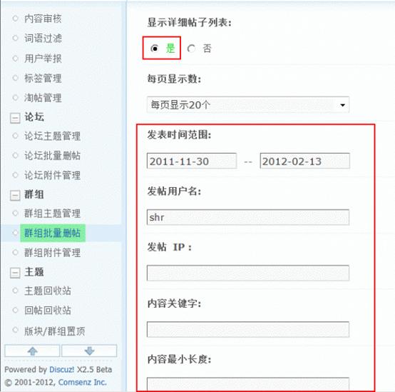 这里的搜索条件中需要同时提供起始时间和终止时间其中之一,以及发帖用户名、发帖IP、内容关键字其中之一,至少共两项必要的条件。
