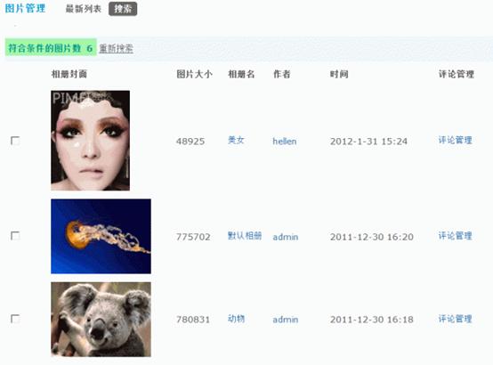 通过图片管理功能,站长可以方便的搜索和管理用户上传的图片,并且连同图片评论一同删除。