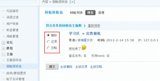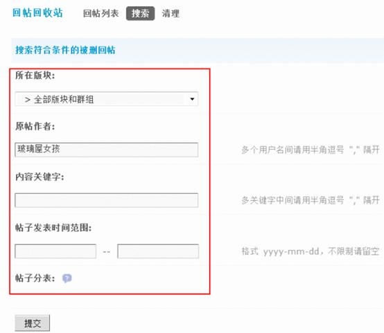 回帖回收站中,可以根据不同的版块,原帖作者,内容关键字,帖子发表时间范围等条件进行搜索,并对搜索出来的帖子进行处理。
