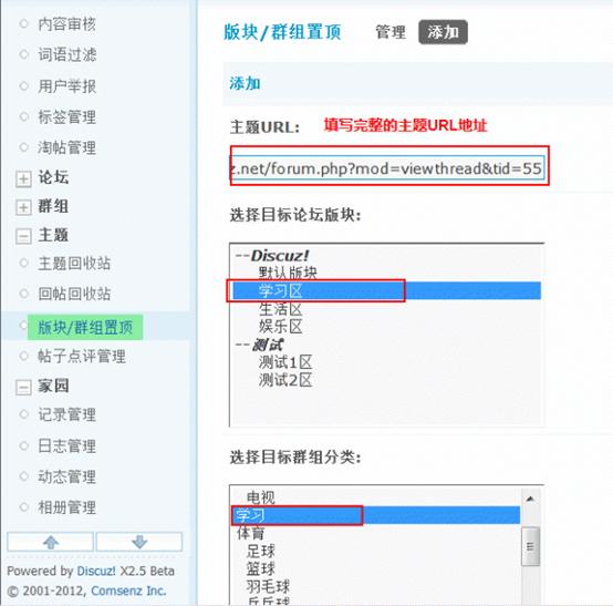 在填好主题URL和目标论坛版块/目标群组分类之后点击提交按钮即可完成置顶帖的添加。