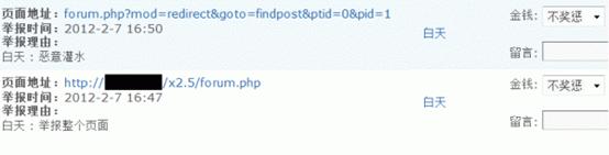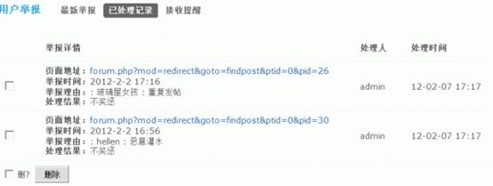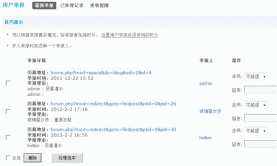 这里列出了用户在站点中最新的举报,包括页面地址、举报理由、举报人、举报时间等,可以根据举报真实情况,给举报者加减积分。