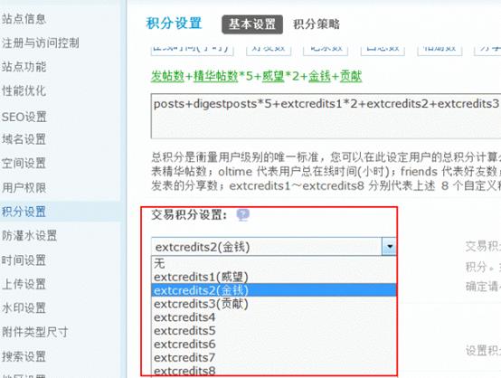 点击该页面右上角的“设置用户举报奖惩使用的积分”链接,我们可以看到“交易积分设置”在这里修改交易积分即可。