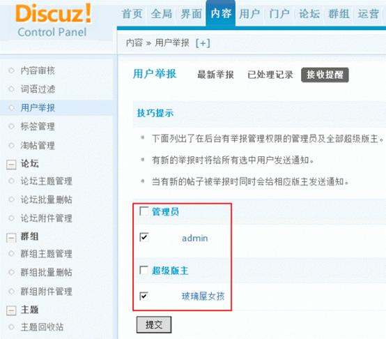 选择接收提醒的管理人员,选中后,当用户举报时接收提醒的管理人员访问站点的时候会有新的提醒。