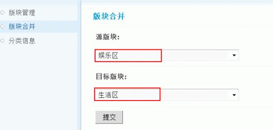 选择“源版块”和“目标版块”,提交即可,源版块的帖子全部转入目标版块,同时删除源版块。