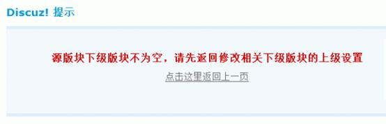 提示内容为:源版块下级版块不为空,请先返回修改相关下级版块的上级设置。