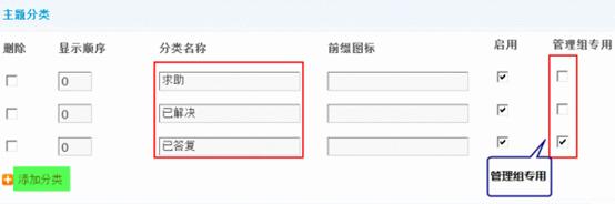 该功能在原来的基本上新增加了管理组专用主题分类,如果勾选那么该主题分类只有管理组成员可以使用,普通会员是不能使用该分类的。