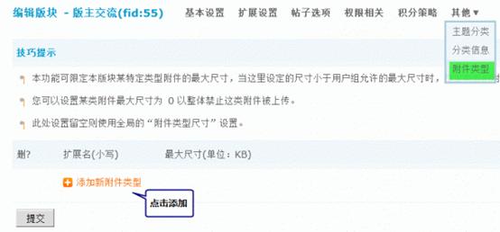 其他设置里包括对版块的主题分类、分类信息以及允许上传的附件类型进行设置。