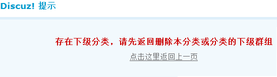 如果该分类下有子分类或群组,将不能删除该分类,需要先删除分类下的子分类或群组再删除分类,提示如下: