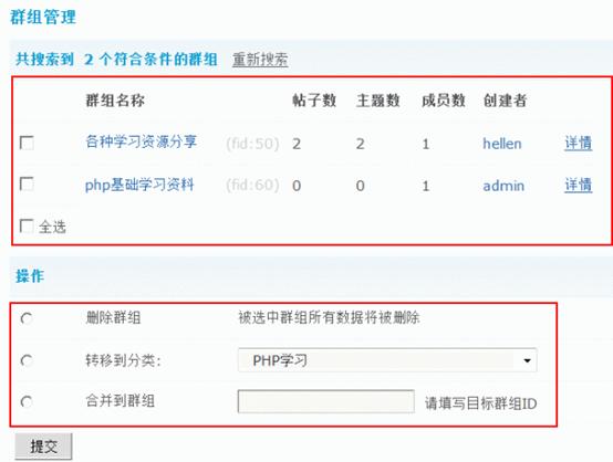 列出了群组名称、帖子数、主题数、成员数以及创建者,点击创建者可以直接跳转到该会员的个人空间。点击“详情”可以直接跳转到群组管理页面。