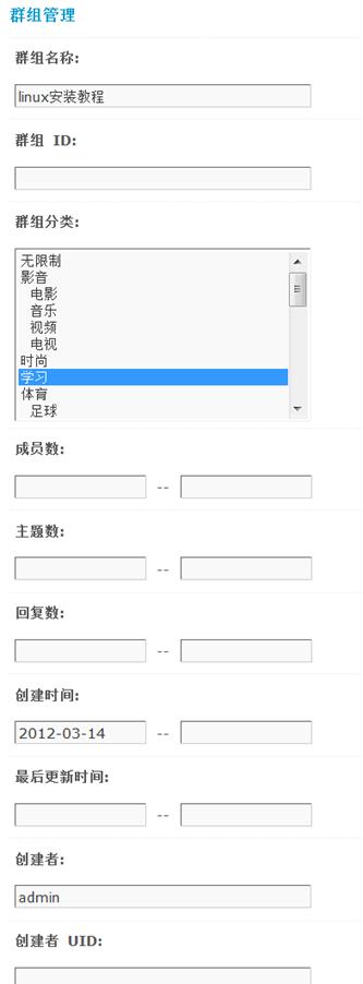 首先通过搜索条件找到需要进行管理的群组,搜索条件包括群组名称、群组ID、群组分类、成员数、主题数、回复数、创建时间、最后更新时间、创建者、创建者 UID。