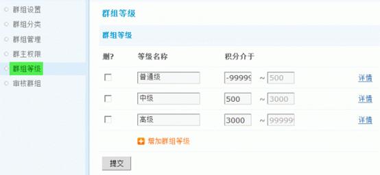 通过群组等级功能可以设置群组的不同等级,如同论坛中的用户组,不同的等级设置不同的权限,等级越高权限越大,这样可以让会员更积极的参与到群组升级中去。