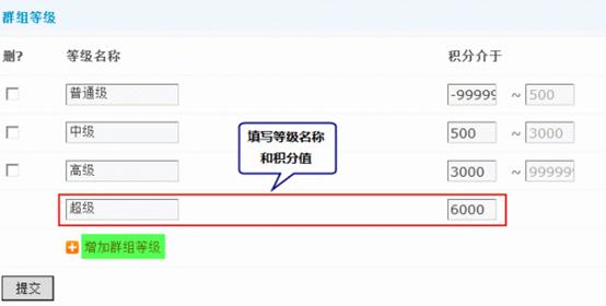 点击“增加群组等级”链接,填写等级名称,设置积分提交即可。