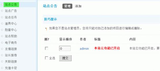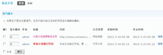 管理人员添加好的公告,可以在这里统一管理,如果你不是站点管理员,你将只能对自己添加的项目进行编辑或删除。