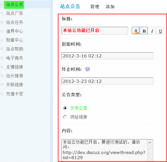 文字公告: 直接输入公告内容,支持 Discuz! 代码,点击该公告将跳转到公告详细信息页面。