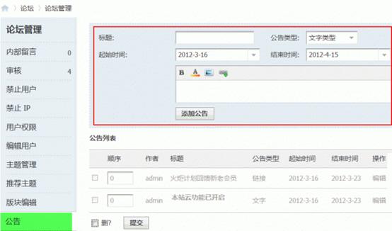 操作路径:【后台】=>【用户】=>【管理组】选择允许添加公告的管理组,点“管理权限”,然后选择“管理面板权限”允许发布公告选择“是”这时该组的管理人员可以在前台的管理面板中添加相应的公告,效果为: