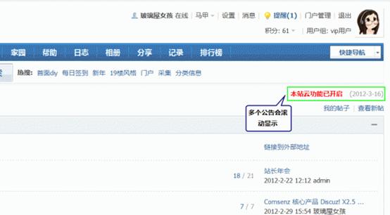 做为站长,有时需要通知站点所有用户一些信息。站点公告即可解决这个问题,您不必逐个用户通知,也不必批量发送短消息或 Email ,只需管理员在后台添加一条公告即可。