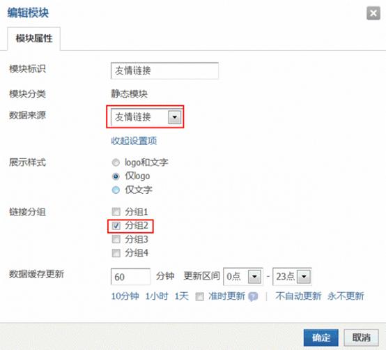 设置该静态模块数据来源为 “友情链接” ,然后可以指定链接分组,默认有四个组,我们选择其中一个,确定。然后可以看到在模块中已经显示出指定的那一组友情链接图标了。