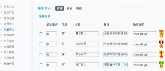勋章图片:勋章图片名称,并将相应图片文件上传到 static/image/common/ 目录中即可。