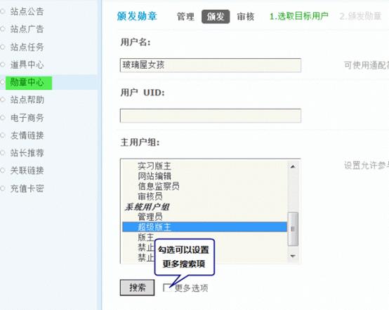 当勋章的领取方式设置为手动发放时,管理员需要在后台通过搜索到符合条件的用户,给其颁发勋章。搜索条件包括用户名、UID、主用户组等,点击“更多选项”可以设置更多的搜索条件。